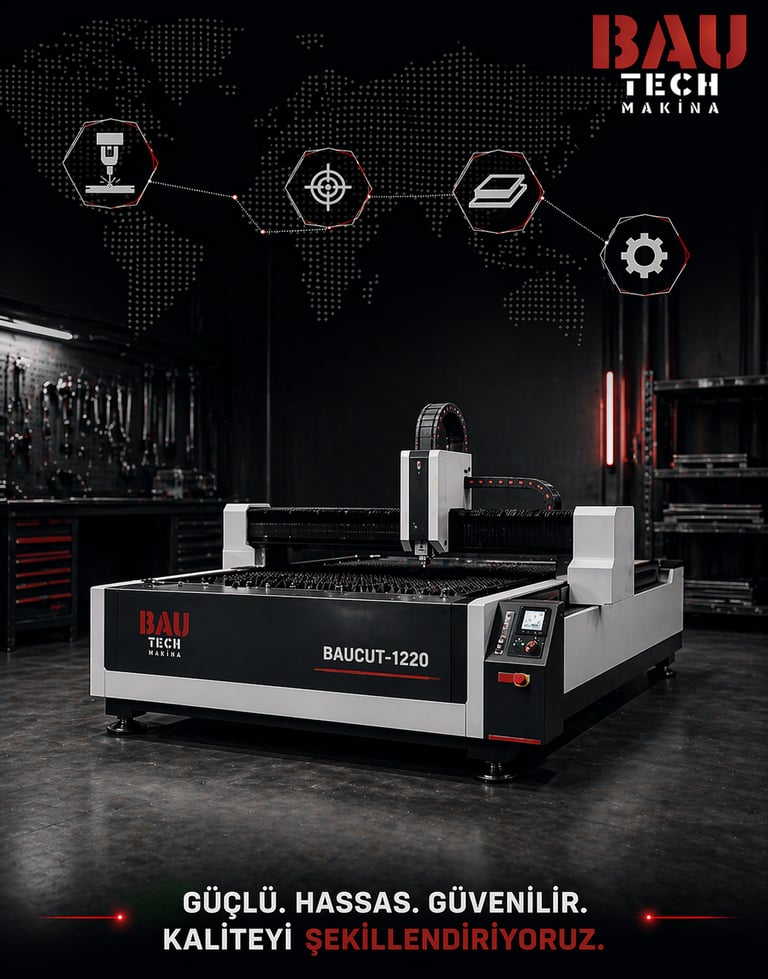 BAUCUT-1220 lazer kesim makinesi, kompakt tasarımı ve yüksek hassasiyetli kesim kabiliyeti ile küçük ve orta ölçekli üretimler için geliştirilmiş verimli bir çözümdür. Güçlü fiber lazer teknolojisi sayesinde farklı sac malzemelerde hızlı, temiz ve hassas kesim performansı sunar.